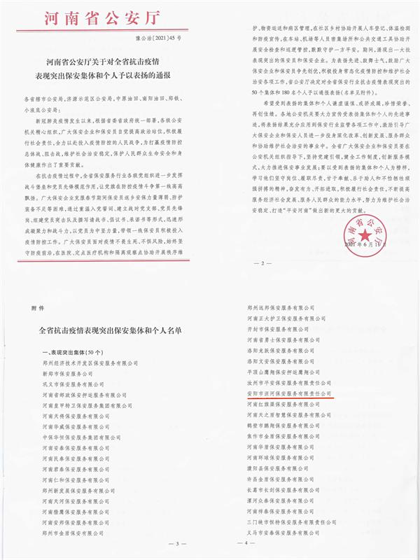 為表?yè)P(yáng)先進(jìn)、鼓舞士氣,鼓勵(lì)廣大保安企業(yè)和保安員爭(zhēng)先創(chuàng)優(yōu),積極投身常態(tài)化疫情防控和維護(hù)社會(huì)治安各項(xiàng)工作,公安部公傳發(fā)【2020】276號(hào)、河南省公安廳豫公治【2021】45號(hào)文件,通報(bào)表?yè)P(yáng)保安行業(yè)抗擊疫情表現(xiàn)突出集體和個(gè)人。其中安陽(yáng)市洹河保安服務(wù)有限責(zé)任公司榮獲“全省抗擊疫情表現(xiàn)突出集體”;公司黨委書(shū)記、董事長(zhǎng)、總經(jīng)理王高峰榮獲“全國(guó)抗擊疫情表現(xiàn)突出個(gè)人”榮譽(yù)稱號(hào)。