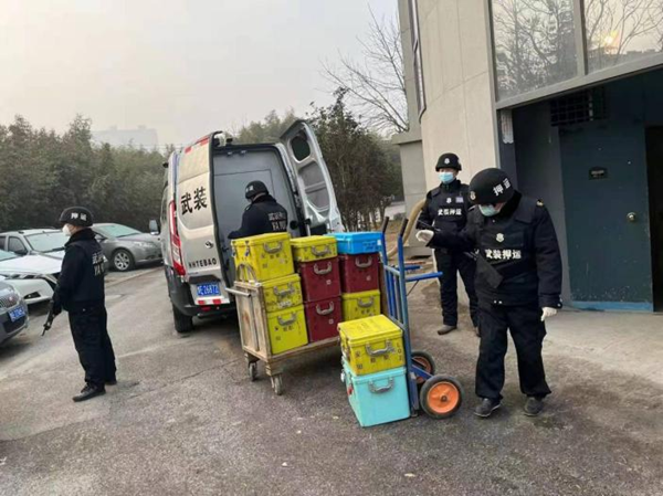 鏡頭二: 2022年1月11日早晨7點(diǎn),守押三大隊(duì)接到中國(guó)銀行通知,要求對(duì)我市殷都支行、紅旗路支行、人民醫(yī)院東院及西院、安陽(yáng)地區(qū)醫(yī)院東院及西院,共六個(gè)網(wǎng)點(diǎn)進(jìn)行押送款勤務(wù)。段俊杰隊(duì)長(zhǎng)迅速向上級(jí)請(qǐng)示后,召集黨員、入黨積極分子及大隊(duì)骨干張青青、張鵬、史淵、張繼辰、宋安武組成臨時(shí)突擊隊(duì)。面對(duì)洶涌而來(lái)的疫情,為確保突擊隊(duì)員人身安全,為每人發(fā)放橡膠手套、口罩等防護(hù)用品。由段俊杰隊(duì)長(zhǎng)親自擔(dān)任押運(yùn)司機(jī),中隊(duì)長(zhǎng)張青青任車長(zhǎng),其他大隊(duì)骨干分別任押運(yùn)員和調(diào)款員。從早晨出車后一直忙碌到中午一點(diǎn),回行簡(jiǎn)單吃過(guò)工作餐,稍事休息后,又繼續(xù)投入到緊張的押運(yùn)工作中。晚上7點(diǎn)在萬(wàn)家燈火的照耀下同志們收車回到單位,為確保駐地疫情防控安全,段隊(duì)長(zhǎng)又安排人員對(duì)出勤車輛及辦公區(qū)域進(jìn)行全面消殺,切實(shí)把疫情防控做嚴(yán)密做扎實(shí)。