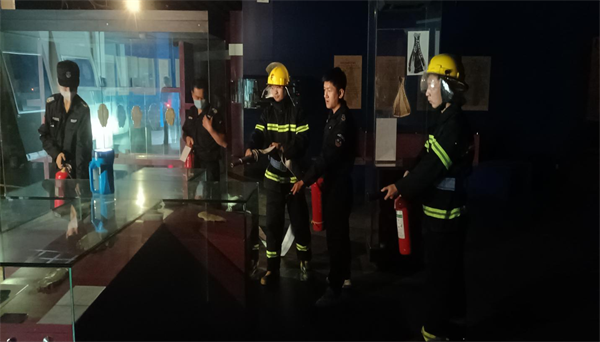 活動現(xiàn)場,時兆東下達演習開始指令。各組人員按照預定方案立即到位,發(fā)現(xiàn)玉器廳有“火情”,及時確認上報,備勤隊員迅速穿戴防護裝備趕赴火場撲救,館內工作人員疏散游客,開辟防火帶,清點人員,做好現(xiàn)場善后處理工作。各組人員各盡其責,緊密配合,經(jīng)過共同努力, “火情”被撲滅,消防演習取得圓滿成功。