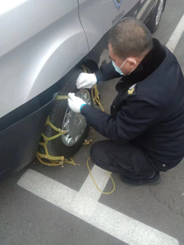 演練現(xiàn)場,大隊領(lǐng)導(dǎo)從防滑鏈的安裝、使用方法、冬季行車注意事項及正確應(yīng)對冰雪等惡劣天氣防范措施等方面進(jìn)行詳細(xì)講解。各車組人員按照規(guī)范程序,將防滑鏈安裝到車輛輪胎上,然后用繃帶將防滑鏈交叉固定,確保車輛在運(yùn)行中防滑鏈更加牢固。