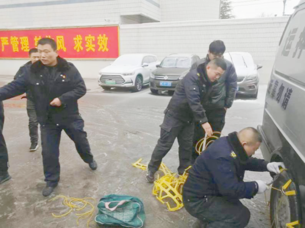上午收車回來后,楊中朝立即督促各車組人員及時檢查防滑鏈,詢問押運途中的工作路況信息,并對車長司機提出要求,一是要注意特殊路段的道路情況,所有車組至少配齊兩套防滑鏈,避免防滑鏈斷裂,偏遠線路要攜帶三條防滑鏈;二是要減速慢行,不要強行超車,勻速30-40公里行駛,車長要密切配合司機觀察路況;三是要用對講機與大隊保持聯(lián)系,及時與客戶溝通,取消偏遠網(wǎng)點的款箱運送,調(diào)整下午點名時間,提前出車,不惜一切代價堅決打贏這次低溫冰雪天氣攻堅戰(zhàn)。