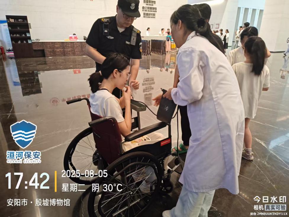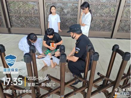 8月5日17時(shí)35分,殷墟博物館南門(mén)檢票區(qū),特保隊(duì)員李昊巡邏時(shí),發(fā)現(xiàn)一名女游客突發(fā)暈厥。隨即上前穩(wěn)定游客身體姿態(tài),詢(xún)問(wèn)同行的郭女士得知,暈倒者為其女兒,因高溫在等待檢票過(guò)程中突發(fā)身體不適繼而暈厥。
