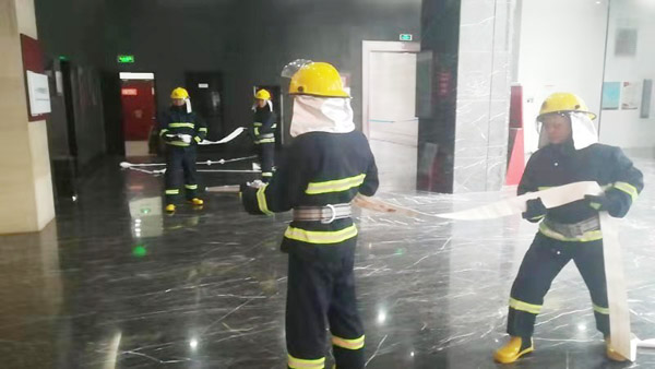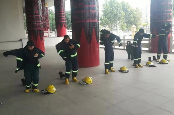 中隊(duì)隊(duì)員在每日消防訓(xùn)練前,在中隊(duì)長的帶領(lǐng)下認(rèn)真學(xué)習(xí)消防安全知識,滅火器和消火栓等消防器材的使用方法,以及火災(zāi)發(fā)生時(shí)的應(yīng)急措施。中隊(duì)理論與實(shí)踐相結(jié)合,提高隊(duì)員的實(shí)際處置火險(xiǎn)能力,組織隊(duì)員開展初起火災(zāi)的撲救、自我安全保護(hù)、組織人員疏散、消防設(shè)施和器材的操作等訓(xùn)練。訓(xùn)練中,特保隊(duì)員發(fā)現(xiàn)火情后,立即啟動火災(zāi)應(yīng)急處置方案,有的隊(duì)員迅速穿上消防服裝,觀察樓層火情,隔離起火設(shè)備,有的連接消防栓,打開滅火器撲滅火險(xiǎn)。