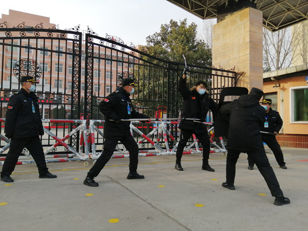 上午9時(shí)30分,在疫情防控期間,兩名社會人員不戴口罩要強(qiáng)行進(jìn)入安陽第五中學(xué)校園,保安員對其進(jìn)行勸阻。但兩人不聽勸告,手持鋼管要沖進(jìn)學(xué)校,并揚(yáng)言用爆炸物威脅。我保安員立刻啟動防暴防恐應(yīng)急預(yù)案。隊(duì)員拿起鋼叉、橡膠棒、防暴盾牌等安保器械與“暴徒”勇敢的搏斗,逐步壓縮暴恐分子活動范圍,并在工學(xué)院中隊(duì)的配合下將兩人制服。