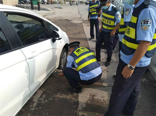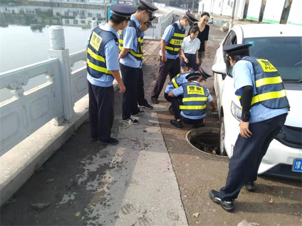 7月24日上午9時許,隊員楊科、李思聰、石玉濤等人,巡邏至文峰路西營街交叉口時,發(fā)現(xiàn)一輛白色轎車的右前輪陷在窨井里,趕忙上前查看情況,應是前幾日暴雨把窨井蓋給沖走了,導致車輛右輪卡在了窨井口。隨后,隊員們有的協(xié)助車主張女士,使用千斤頂把車輛頂起,有的在附近尋找被雨水沖走的窨井蓋。隊員們把找到井蓋放回原位,幫助車主安全離開,車主張女士一再表示感謝。