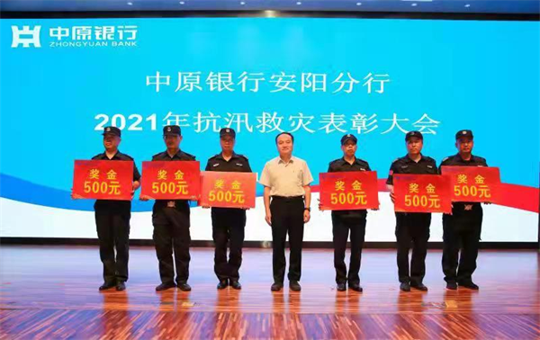 2021年9月23日,中原銀行安陽分行在三樓報告廳隆重召開先進表彰大會,分行領導班子、各支行行長和部門經(jīng)理全部參加,會議由分行紀委書記牛書記主持,表彰在“7.22”防汛救災中表現(xiàn)突出的先進集體和個人,大會表揚了安陽市洹河保安服務公司駐分行人防四大隊保安中隊長田衛(wèi)順、郭海波等6位先進個人,并每人發(fā)放獎金500元。表揚他們在大災面前“困難時刻拉得出,危急時刻頂?shù)蒙?,關鍵時刻靠得住,決戰(zhàn)時刻打得贏”的防汛救災精神。
