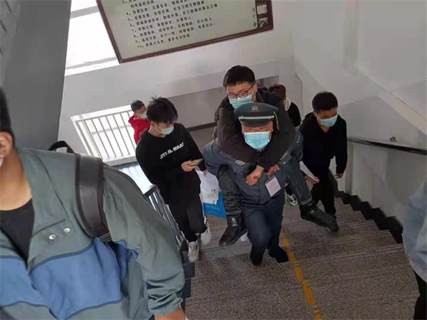 10月30日上午9點(diǎn),在安陽市第八中學(xué)教師資格證考試入場前,看到一位校園保安將一名考生從一樓背上四樓,在場的考生、監(jiān)考老師對(duì)這位校園保安的舉動(dòng)嘖嘖稱贊。