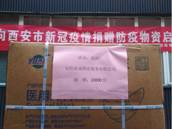 當前,陜西省西安市新冠肺炎疫情防控形勢嚴峻復雜,正是到了萬眾一心、攻堅克難、共抗疫魔的關鍵時期。西安市近3000家物業(yè)服務企業(yè)、10余萬物業(yè)從業(yè)人員晝夜奮戰(zhàn)在疫情防控第一線,全力守護人民群眾的生命安全和身體健康。為彰顯社會擔當,弘揚中華民族“一方有難,八方支援”的優(yōu)良品德。安陽鼎誠物業(yè)服務有限公司在得知西安市疫情肆虐的第一時間內,召開領導班子會議,決定組織發(fā)動公司員工奉獻愛心,捐贈醫(yī)用外科口罩20000副,并向奮戰(zhàn)在抗疫一線的10余萬西安物業(yè)人致以崇高敬意,祈福西安,戰(zhàn)勝疫情!