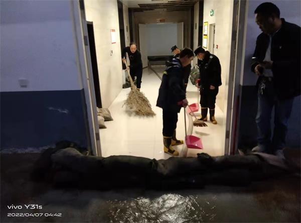 4月6日晚上十一點(diǎn),人防一大隊(duì)駐聯(lián)通公司東區(qū)崗點(diǎn)中、夜班的隊(duì)員交接完工作之后,夜班值班隊(duì)員杜懷濤、孟慶春開(kāi)始接班后的正常巡樓工作。當(dāng)他們巡邏到負(fù)二層時(shí),聽(tīng)到有水流的聲音,職業(yè)的敏感提醒他們,有管道跑水,順著流水的聲音巡去,果不其然,負(fù)二層中央空調(diào)系統(tǒng)供水管道破裂,管道里的水不停向外噴射,如果不及時(shí)處置,會(huì)引發(fā)負(fù)二層注水,給客戶造成財(cái)產(chǎn)損失。兩位值班隊(duì)員馬上通知監(jiān)控中心和值班班長(zhǎng),值班班長(zhǎng)邱文濤接到報(bào)警后迅速向中隊(duì)長(zhǎng)董紅衛(wèi)匯報(bào)情況,同時(shí)安排夜班同志到現(xiàn)場(chǎng)處理積水,董紅衛(wèi)趕赴現(xiàn)場(chǎng)后和值班隊(duì)員一起配合專(zhuān)業(yè)的維修人員處置險(xiǎn)情,經(jīng)過(guò)近五個(gè)小時(shí)的奮戰(zhàn),險(xiǎn)情得到妥善解決。
