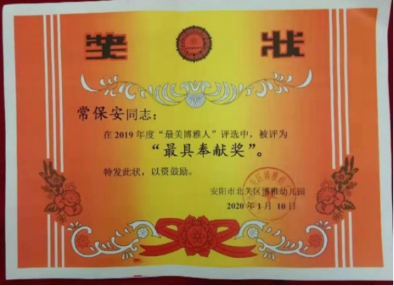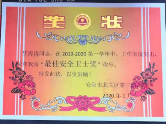 獲獎(jiǎng)隊(duì)員中,駐北關(guān)區(qū)區(qū)直幼兒園張強(qiáng)在2019年度“不忘初心 花開綻放 美麗北幼人”評(píng)選活動(dòng)中,榮獲“美麗奉獻(xiàn)獎(jiǎng)”;駐北關(guān)區(qū)博雅幼兒園常保安在“美麗博雅人”評(píng)選中,被評(píng)為“杰出奉獻(xiàn)獎(jiǎng)”;駐北關(guān)區(qū)第三幼兒園畢海濤榮獲“杰出安全衛(wèi)士獎(jiǎng)”稱號(hào)。自該大隊(duì)擔(dān)負(fù)北關(guān)區(qū)教育系統(tǒng)安全保衛(wèi)工作以來,駐各小學(xué)、幼兒園保安員夯實(shí)保安技能,開展應(yīng)急處置預(yù)案演練,認(rèn)真履行職責(zé),為創(chuàng)建平安校園做出了突出貢獻(xiàn)。