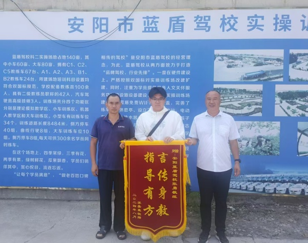 一面錦旗,一個故事;一聲肯定,一份責(zé)任。8月23日一大早,已經(jīng)成功拿證、順利畢業(yè)的學(xué)員蘇嘉豪特意來到藍(lán)盾駕校訓(xùn)練場,將一面印有“指導(dǎo)有方 言傳身教”字樣的錦旗,鄭重地送到了教練員張勇的手中,對學(xué)車期間教練的辛勤付出表示深深的感謝以及對藍(lán)盾駕校的肯定。