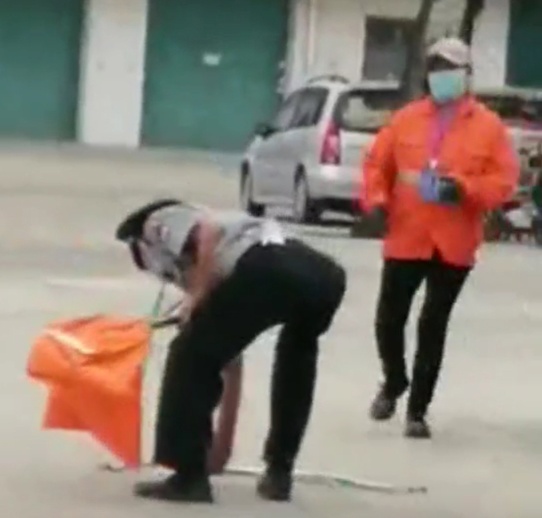 下午2點(diǎn)40許,保潔車經(jīng)過4號門,路面不平,工具掉落地上,人防二大隊(duì)王紅軍喊停環(huán)衛(wèi)人員,幫其撿起清潔工具。