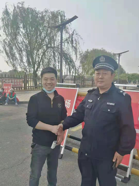 5月17日下午,安陽縣都里鄉(xiāng)好井村村民路鵬手持寫著“人民衛(wèi)士 盡職盡責(zé)”的錦旗趕到殷都區(qū)文廣新局文保巡防班,感謝巡防班班長王俊峰和隊員張文喜無私幫助其找回錢包的行為。
