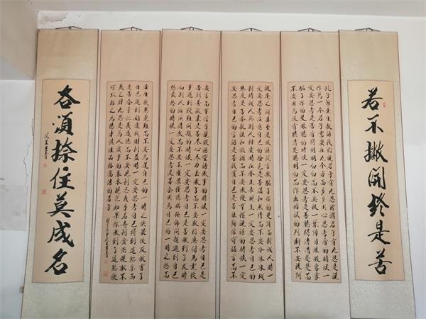 杜先生家大門(mén)朝東,坐落在村東一處較為平緩的崗地,頗具靜水流深、紫氣東來(lái)之神韻。這里儼然是一處天然氧吧,門(mén)前開(kāi)闊地東側(cè),是一片蔥郁的樹(shù)林,林中不知名的鳥(niǎo)兒發(fā)出歡快的叫聲,好像和主人一起歡迎客人的到來(lái)。我們隨主人進(jìn)院來(lái)到北屋,一股書(shū)香氣撲面而來(lái),正門(mén)墻上一組行書(shū)四扇屏字畫(huà)映入眼簾,上書(shū)孔子老先生教誨的九思,兩側(cè)是一副醒目的對(duì)聯(lián):若不撇開(kāi)終是苦,各須捺住莫成名。
