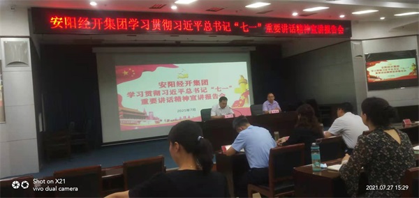 2021年7月27日下午,安陽市洹河保安公司黨委組織10名黨員干部,參加了由中共安陽經(jīng)開集團黨委舉辦的學習貫徹習近平總書記“七一”重要講話精神宣講報告會,會議邀請河南護理職業(yè)學院馬克思主義學院副院長、副教授張艷林主講,會議由經(jīng)開集團黨委書記、董事長齊方同志主持。