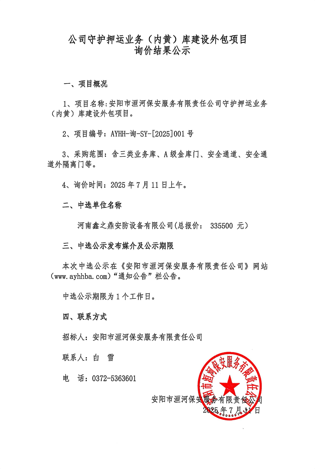 公司守護(hù)押運業(yè)務(wù)(內(nèi)黃)庫建設(shè)外包項目詢價結(jié)果公示